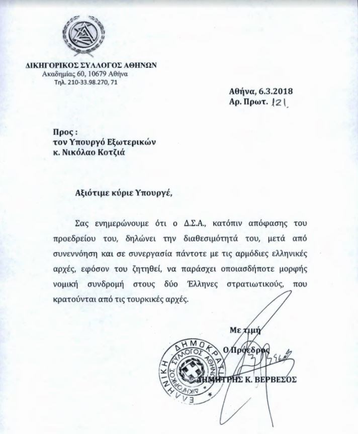 “Ο Δικηγορικός Σύλλογος Αθηνών, με σημερινή απόφαση του προεδρείου του, δηλώνει την διαθεσιμότητά του, μετά από συνεννόηση και σε συνεργασία πάντοτε με τις αρμόδιες ελληνικές αρχές, εφόσον του ζητηθεί, να παράσχει οποιασδήποτε μορφής νομική συνδρομή στους δύο Έλληνες στρατιωτικούς, που κρατούνται από τις τουρκικές αρχές. Ο Πρόεδρος του Δ.Σ.Α. απέστειλε προς τούτο σχετική επιστολή στους αρμόδιους κυβερνητικούς παράγοντες”.