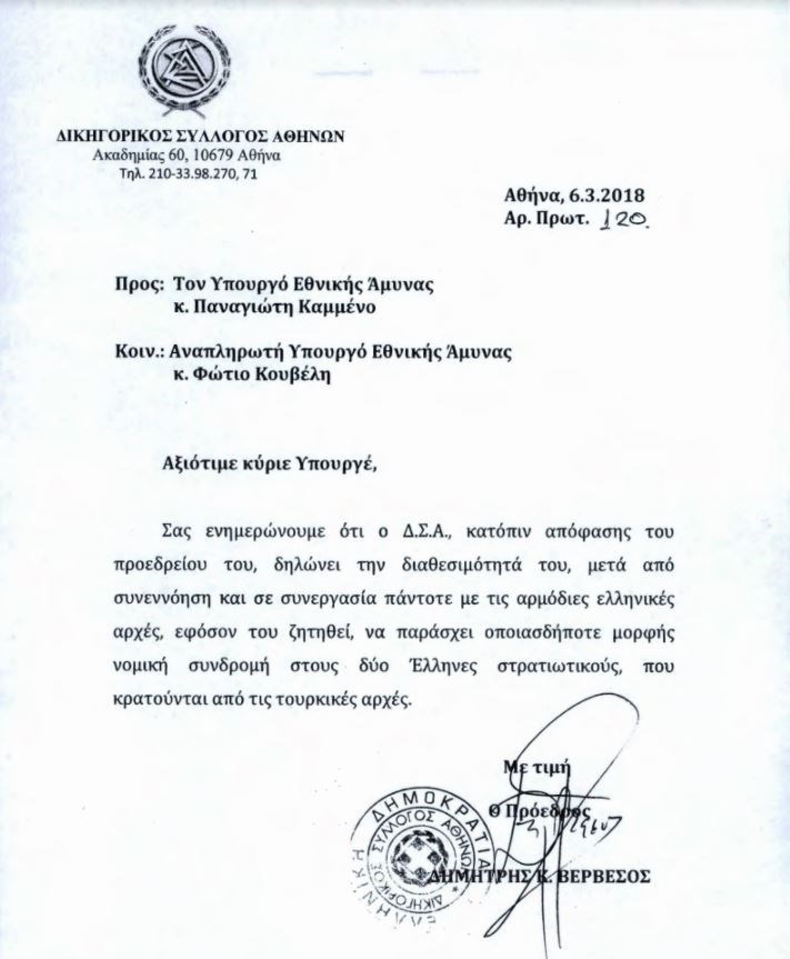“Ο Δικηγορικός Σύλλογος Αθηνών, με σημερινή απόφαση του προεδρείου του, δηλώνει την διαθεσιμότητά του, μετά από συνεννόηση και σε συνεργασία πάντοτε με τις αρμόδιες ελληνικές αρχές, εφόσον του ζητηθεί, να παράσχει οποιασδήποτε μορφής νομική συνδρομή στους δύο Έλληνες στρατιωτικούς, που κρατούνται από τις τουρκικές αρχές. Ο Πρόεδρος του Δ.Σ.Α. απέστειλε προς τούτο σχετική επιστολή στους αρμόδιους κυβερνητικούς παράγοντες”.
