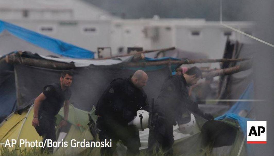 Όπως φαίνεται και στη φωτογραφία του Associated Press, οι άνδρες της αστυνομίας προσεγγίζουν μία μία τις σκηνές για να ελέγξουν και να ενημερώσουν τους πρόσφυγες για την εκκένωση.