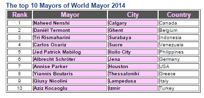 H λίστα με τους δέκα καλύτερους δημάρχους του κόσμου για το 2014 διαμορφώθηκε από τη δημόσια ψηφοφορία που οργάνωσε το ανεξάρτητο ίδρυμα «City Mayors Foundation» για το βραβείο “World Mayor Prize”.