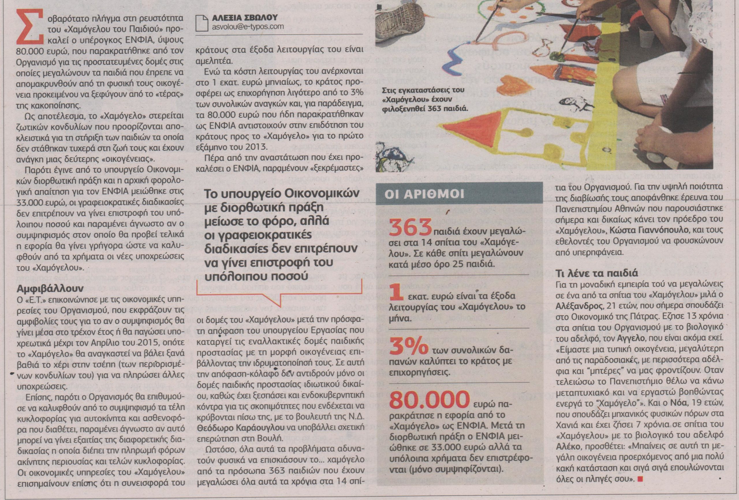 Σοβαρότατο πλήγμα στη ρευστότητα του «Χαμόγελου του Παιδιού» προκαλεί ο υπέρογκος ΕΝΦΙΑ, ύψους 80.000 ευρώ, που παρακρατήθηκε από τον Οργανισμό για τις προστατευμένες δομές στις οποίες μεγαλώνουν τα παιδιά που έπρεπε να απομακρυνθούν από τη φυσική τους οικογένεια προκειμένου να ξεφύγουν από το «τέρας» της κακοποίησης.