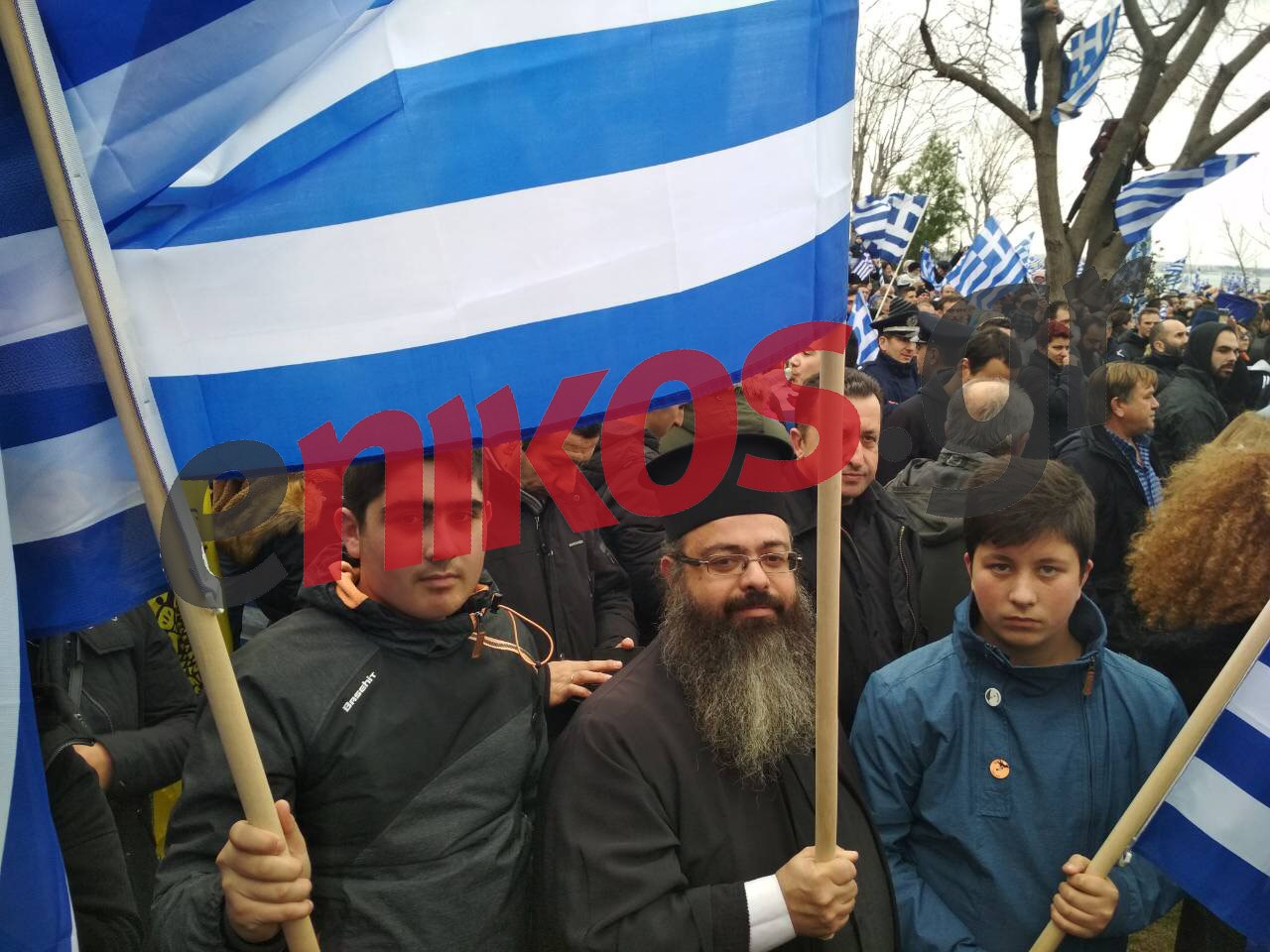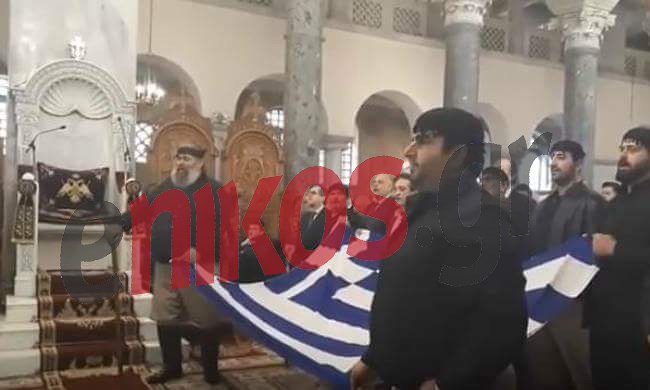 Νωρίτερα ντυμένοι παραδοσιακά, οι Κρητικοί που έφτασαν στη συμπρωτεύουσα, βρέθηκαν στον Ιερό Ναό του Αγίου Δημητρίου και έψαλαν τον Εθνικό Ύμνο, κρατώντας την ελληνική σημαία, μαζί με τους άλλους παρευρισκομένους στη Θεία Λειτουργία, που τελέστηκε, όπως είχε ανακοινωθεί τις προηγούμενες ημέρες, με αφορμή το σημερινό συλλαλητήριο.