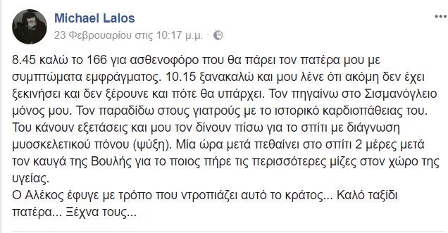 Αίσθηση προκαλεί η καταγγελία του γιου του πρώην Δημάρχου Νέας Φιλαδέλεφειας Αλέκου Λάλου, ο οποίος έφυγε από τη ζωή την Παρασκευή.Ο γιος του πρώην δημάρχου και σημερινός αντιδήμαρχος Φιλαδέλφειας, Μιχάλης Λάλος, καταγγέλλει πως ο πατέρας του άφησε την τελευταία του πνοή εξαιτίας λανθασμένης διάγνωσης.Συγκεκριμένα, υποστηρίζει πως ο πατέρας του είχε συμπτώματα εμφράγματος και το ΕΚΑΒ δεν ερχόταν να τον παραλάβει. Στη συνέχεια, όπως καταγγέλλει, πήγε ο ίδιος τον πατέρα του στο νοσοκομείο και οι γιατροί διέγνωσαν πως πάσχει από ψύξη…Γράφει συγκεκριμένα:«8.45 καλώ το 166 για ασθενοφόρο που θα πάρει τον πατέρα μου με συμπτώματα εμφράγματος. 10.15 ξανακαλώ και μου λένε ότι ακόμη δεν έχει ξεκινήσει και δεν ξέρουνε και πότε θα υπάρχει. Τον πηγαίνω στο Σισμανόγλειο μόνος μου. Τον παραδίδω στους γιατρούς με το ιστορικό καρδιοπάθειας του. Του κάνουν εξετάσεις και μου τον δίνουν πίσω για το σπίτι με διάγνωση μυοσκελετικού πόνου (ψύξη). Μία ώρα μετά πεθαίνει στο σπίτι 2 μέρες μετά τον καυγά της Βουλής για το ποιος πήρε τις περισσότερες μίζες στον χώρο της υγείας.