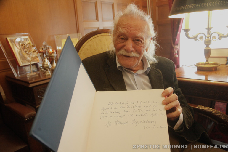 Τέλος ο κ. Γλέζος έδειξε στον Αρχιεπίσκοπο Ιερώνυμο, ένα βιβλίο που του είχε προσφέρει ο Προκάτοχός του μακαριστός Αρχιεπίσκοπος Χριστόδουλος με σχετική αφιέρωση.