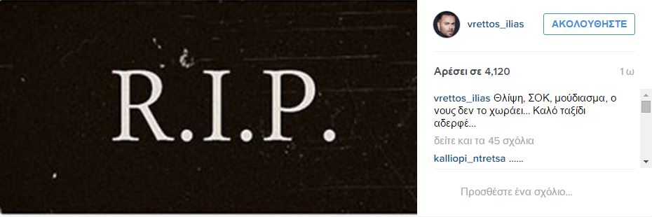 Ο τραγουδιστής ανέβασε μια φωτογραφία που έγραφε R.I.P, συνοδεύοντας της με το σχόλιο «Θλίψη, ΣΟΚ, μούδιασμα, ο νους δεν το χωράει… Καλό ταξίδι αδερφέ…».
