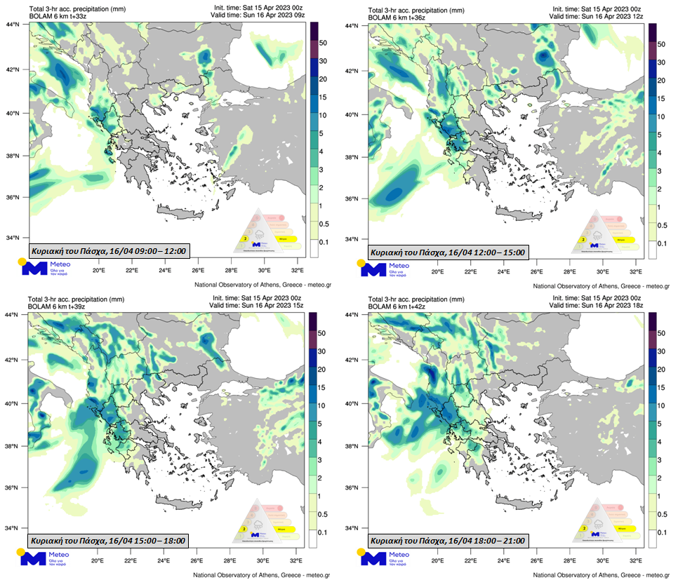 Στους χάρτες που ακολουθούν παρουσιάζεται ο υετός που αναμένεται ανά τρίωρο από το πρωί έως το απόγευμα της Κυριακής του Πάσχα, 16/04.