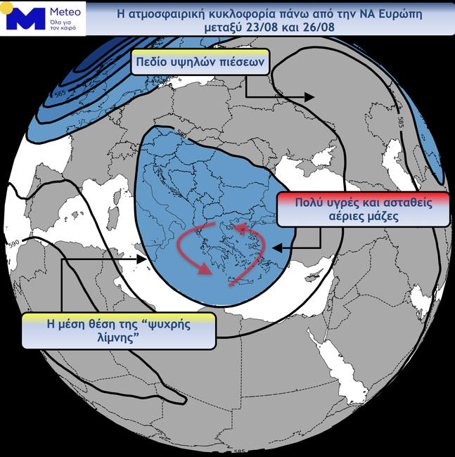 Βασική αιτία για τις πολυήμερες, έντονες και εκτεταμένες βροχοπτώσεις αποτέλεσε μια ατμοσφαιρική διαταραχή στην ανώτερη τροπόσφαιρα, η οποία προερχόμενη από τον Β. Ατλαντικό κινήθηκε αρχικά προς την ευρύτερη περιοχή της Αδριατικής και των ΒΔ Βαλκανίων στην πρώτη φάση της κακοκαιρίας, επιδεινώνοντας έτσι σταδιακά τον καιρό στην χώρα μας κατά την διάρκεια του Σαββατοκύριακου 20-21/08 στα κεντρικά και βόρεια.