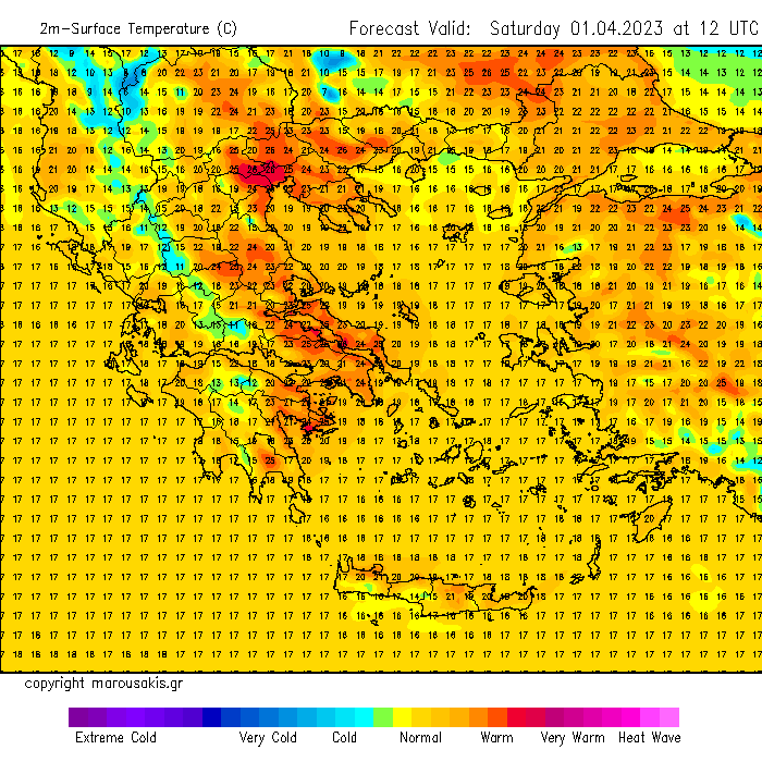 Σύμφωνα με τα τελευταία προγνωστικά στοιχεία που έχουμε στη διάθεσή μας φαίνεται ότι τόσο το Σάββατο αλλά και η Κυριακή θα είναι δύο ημέρες με γενικά υψηλές θερμοκρασίες με τον υδράργυρο όπως φαίνεται και στον προγνωστικό μας χάρτη να σκαρφαλώνει προς τα ανατολικά ηπειρωτικά και τη βόρεια Κρήτη ακόμη και στους 25° με 27° μιας και ο νοτιάς θα λειτουργήσει σαν καταβάτης ο γνωστός μας λίβας».