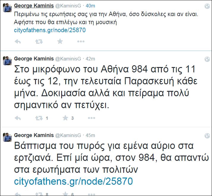 “Βάπτισμα του πυρός για εμένα αύριο στα ερτζιανά. Επί μία ώρα, στον 984, θα απαντώ στα ερωτήματα των πολιτών. Στο μικρόφωνο του Αθήνα 984 από τις 11 έως τις 12, την τελευταία Παρασκευή κάθε μήνα. Δοκιμασία αλλά και πείραμα πολύ σημαντικό αν πετύχει. Περιμένω τις ερωτήσεις σας για την Αθήνα, όσο δύσκολες και αν είναι. Αφήστε που θα επιλέγω και τη μουσική…” έγραψε ο Γιώργος Καμίνης στο Twitter.