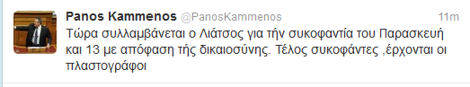 “Τώρα συλλαμβάνεται ο Λιάτσος για την συκοφαντία του στην “Παρασκευή και 13″, με απόφαση της δικαιοσύνης. Τέλος οι συκοφάντες, έρχονται οι πλαστογράφοι”, έγραψε ο πρόεδρος των Ανεξάρτητων Ελλήνων Πάνος Καμμένος σχετικά με τη σύλληψη του εκδότη της εφημερίδας “Παρασκευή και 13” Αιμίλιου Λιάτσου.