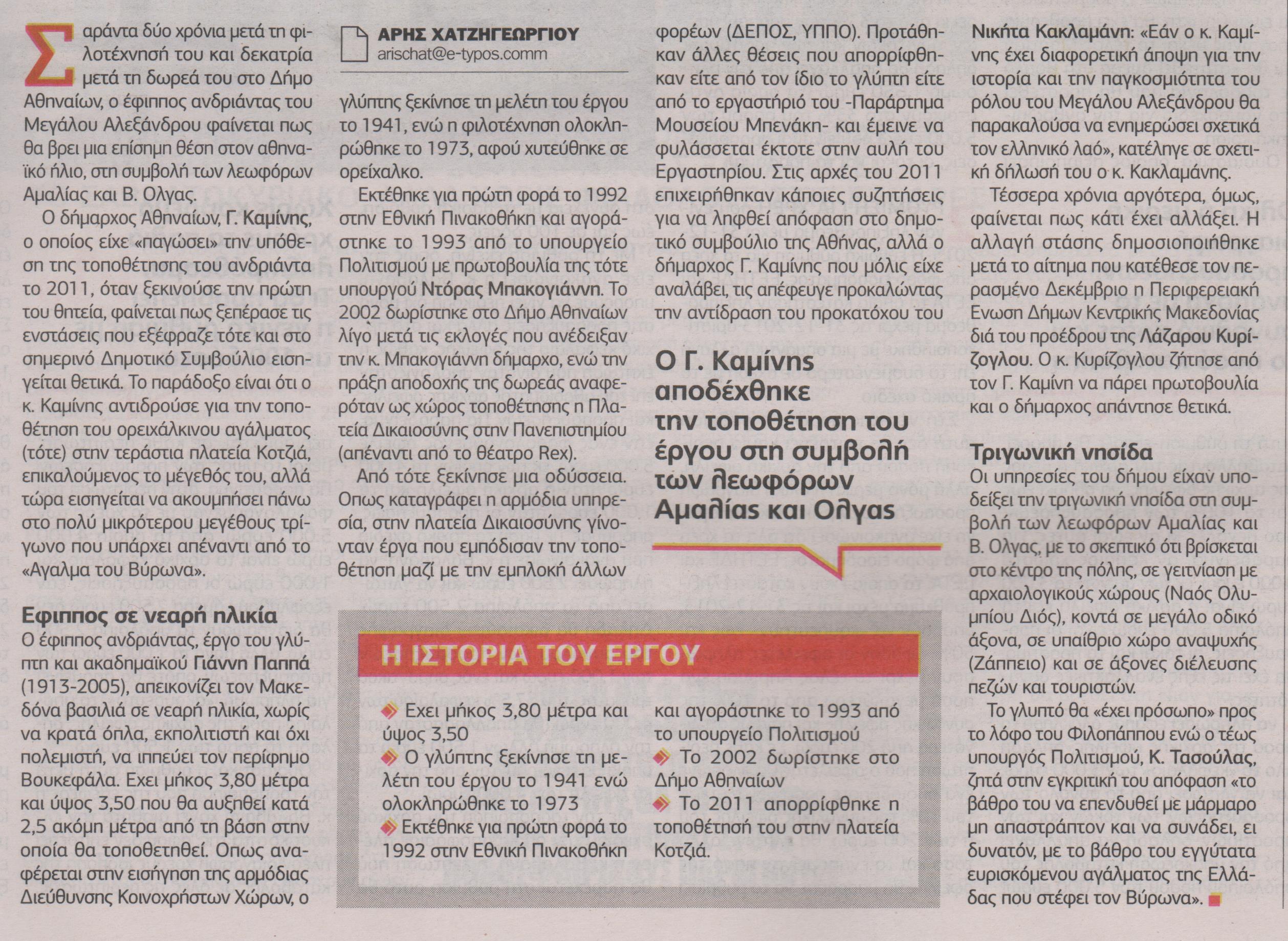Σαράντα δύο χρόνια μετά τη φιλοτέχνησή του και δεκατρία μετά τη δωρεά του στον Δήμο Αθηναίων, ο έφιππος ανδριάντας του Μεγάλου Αλεξάνδρου, φαίνεται πως θα βρει μια επίσημη θέση στον αθηναϊκό ήλιο, στη συμβολή των λεωφόρων Αμαλίας και Β. Όλγας.