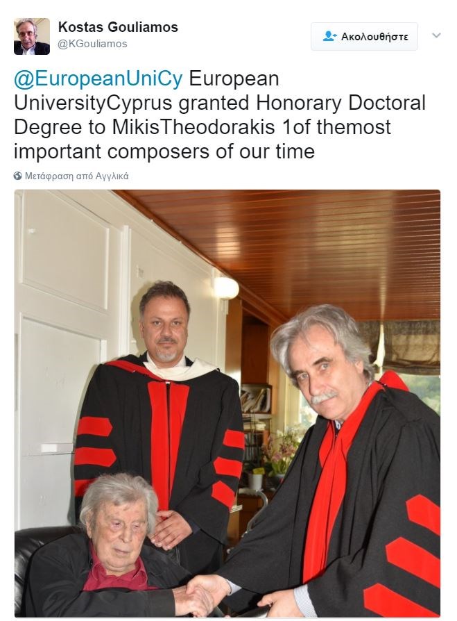 Σημαντική στιγμή για την Κύπρο η αναγόρευση του Μίκη Θεοδωράκη σε επίτιμο διδάκτορα μουσικής του Ευρωπαϊκού Πανεπιστημίου Κύπρου.