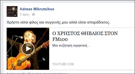 Ο Ανδρέας Μικρούτσικος με ανάρτησή του στην προσωπική του σελίδα στο Facebook δεν έκρυψε την ενόχλησή του για τις δηλώσεις που έκανε ο Χρήστος Θηβαίος στην εκπομπή της Δέσποινας Αυγερίδου στο Δημοτικό Ραδιόφωνο Θεσσαλονίκης.