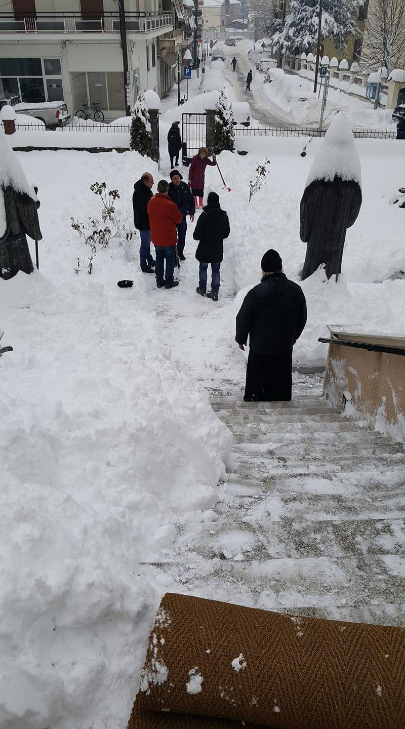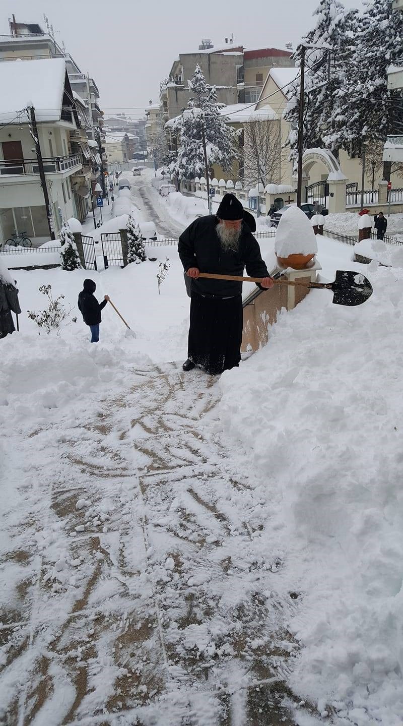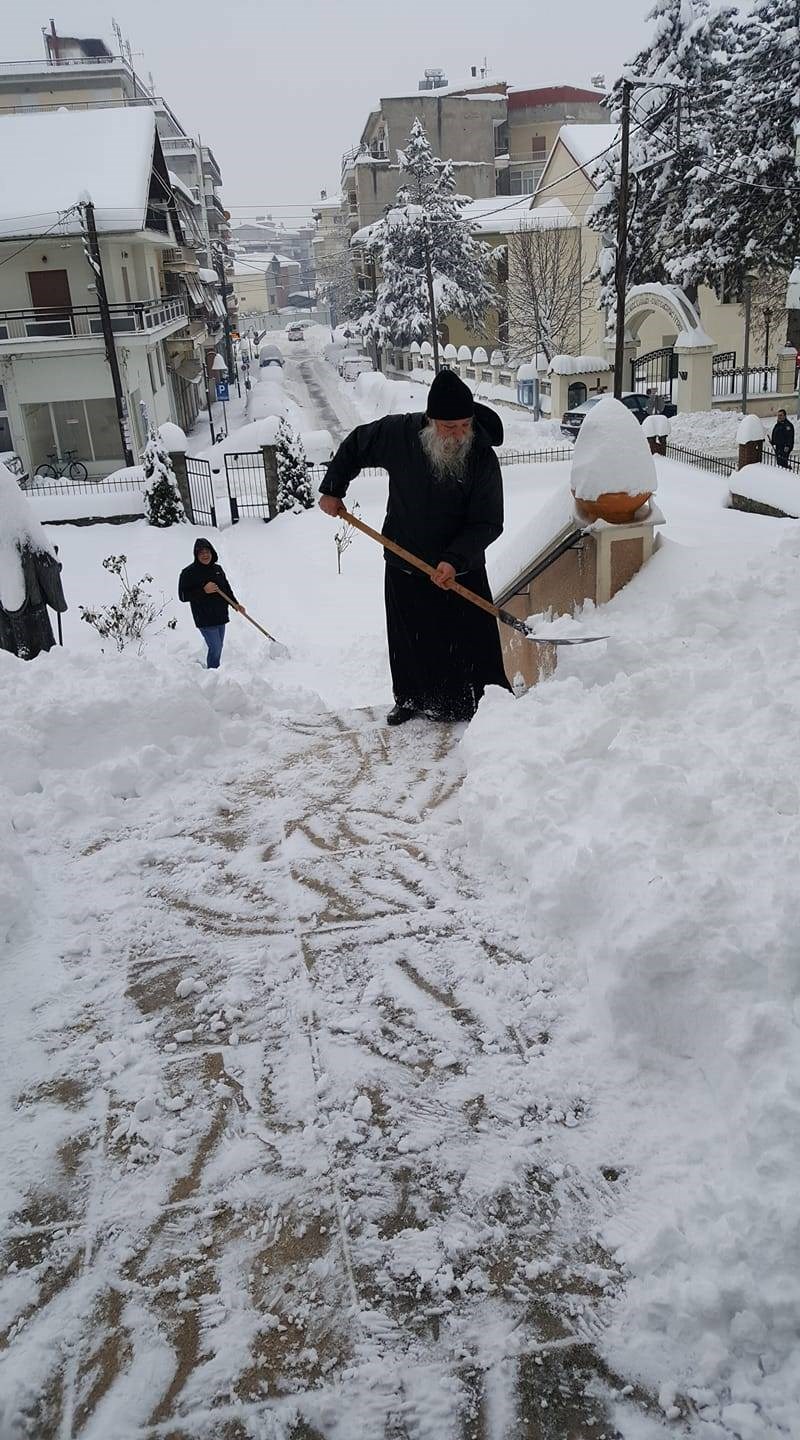 Μια διαφορετική εικόνα κάνει τις τελευταίες ώρες το γύρο των κοινωνικών δικτύων και όχι άδικα. Στη φωτογραφία φαίνεται ο Mητροπολίτης Γρεβενών Δαβίδ με ένα φτυάρι στο χέρι να απομακρύνει το χιόνι από την είσοδο του Μητροπολιτικού Μεγάρου της πόλης.