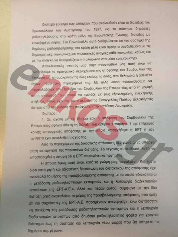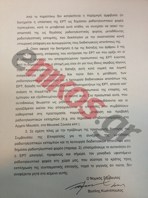 “Από το περιεχόμενο της δικαστικής απόφασης δεν φαίνεται να υπάρχει ρητή κατάργηση της παραπάνω διάταξης. Το γεγονός αυτό έδωσε λαβή να υποστηριχθεί η άποψη ότι η ΕΡΤ παραμένει καταργημένη. Η άποψη όμως αυτή είναι, κατά τη γνώμη μας, εσφαλμένη”, αναφέρει χαρακτηριστικά ο νομικός σύμβουλος της ΕΡΤ.