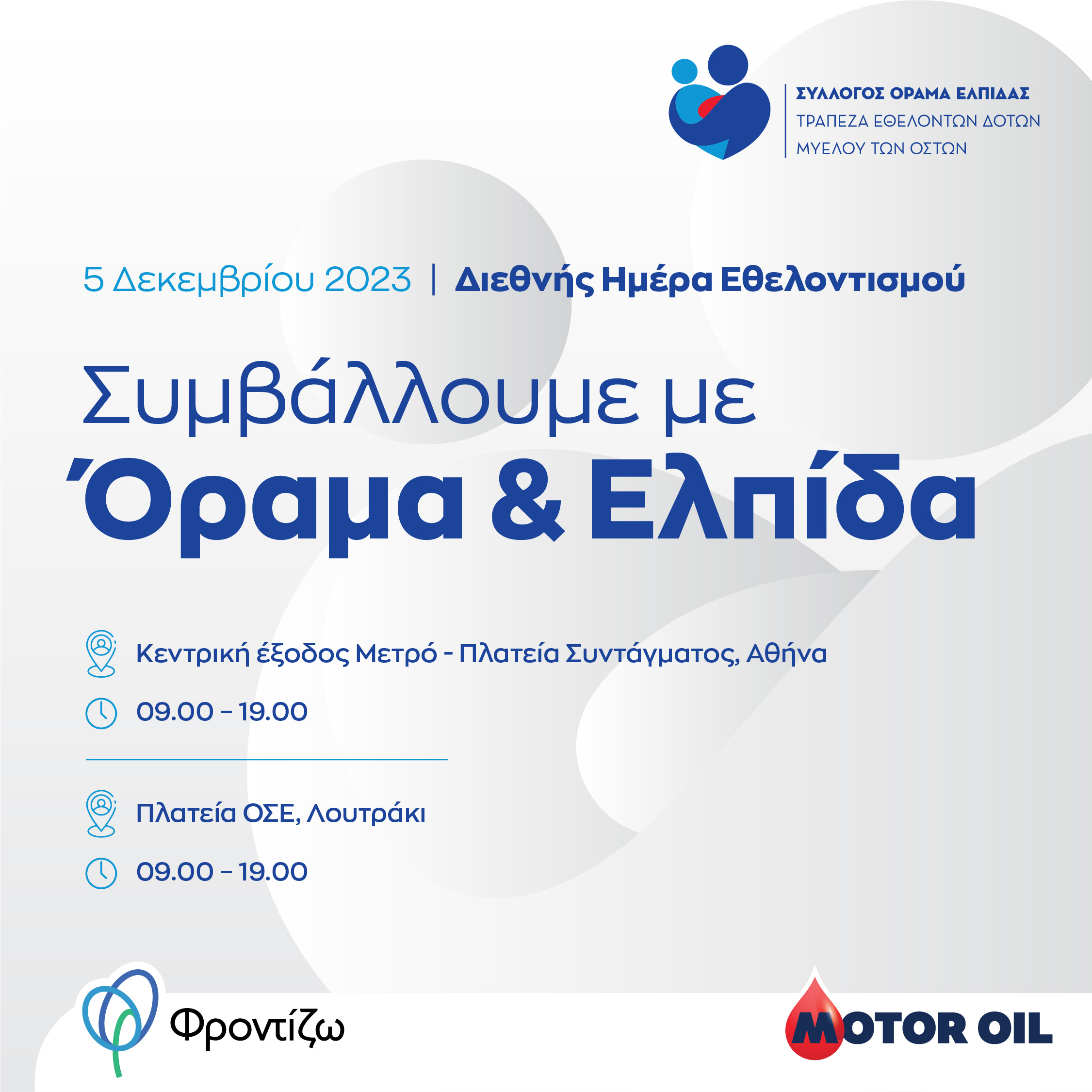 Με τη δύναμη της Ενέργειας, ο Όμιλος Motor Oil φροντίζει διαχρονικά για το κοινό μας Μέλλον. Ένα μέλλον που βασίζεται στην ευθύνη και την προσφορά και οφείλει να συμπορεύεται με την κατανόηση, την εκτίμηση, την αξιοπιστία, τη συνέπεια, τη συνέχεια, τη σταθερότητα. Η Motor Oil, λοιπόν, με υψηλό αίσθημα ευθύνης, προσκαλεί όσες και όσους το επιθυμούν στην Πλατεία Συντάγματος στην Αθήνα, στην κεντρική έξοδο του Μετρό, και στην Πλατεία ΟΣΕ στο Λουτράκι, ώρες 09.00 – 19.00, για να ενώσουμε τις δυνάμεις μας με ένα σπουδαία μήνυμα: Δώσε ΕΛΠΙΔΑ, Δώσε ΖΩΗ, γίνε εθελοντής δότης Μυελού των Οστών!»