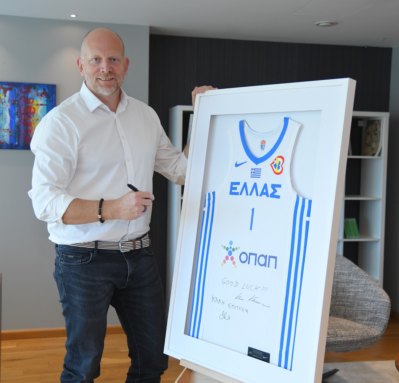 Ο Διευθύνων Σύμβουλος του ΟΠΑΠ, Jan Karas, υπογράφει τη φανέλα που δόθηκε ως δώρο στην Εθνική Ανδρών, από τη διοίκηση και τους εργαζόμενους του ΟΠΑΠ, για να της ευχηθούν «καλή επιτυχία» στο Παγκόσμιο Κύπελλο Μπάσκετ