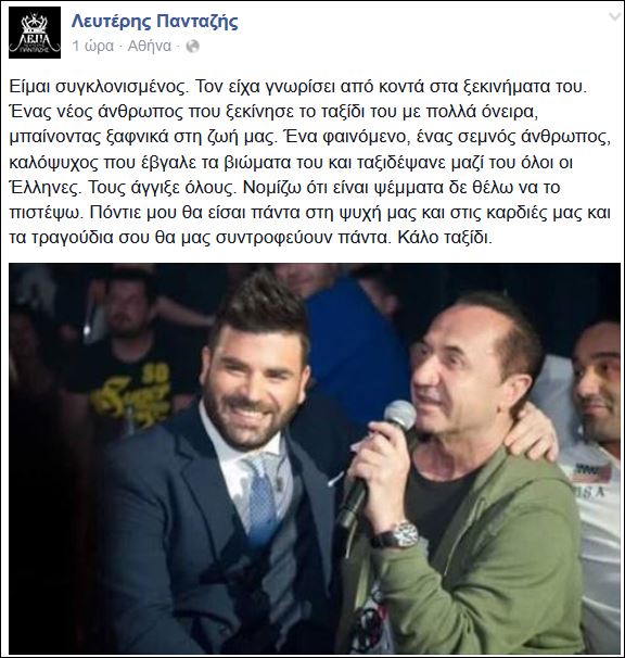 Συγκλονισμένος από τον πρόωρο χαμό του Παντελή Παντελίδη δηλώνει ο Λευτέρης Πανταζής με ανάρτησή του στην προσωπική του σελίδα στο Facebook.