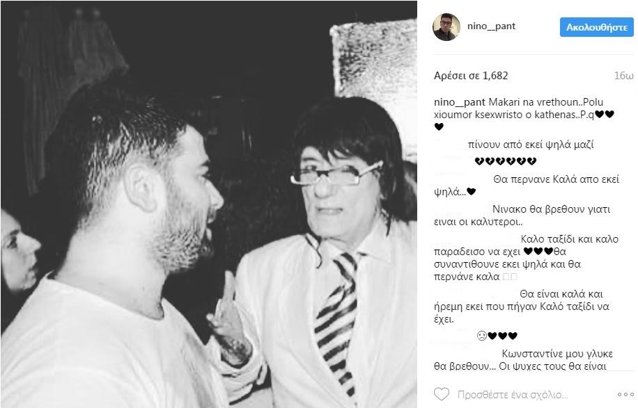 Ο μικρότερος αδελφός του Παντελή Παντελίδη, Νίνο, συγκίνησε τους διαδικτυακούς του φίλους, ανεβάζοντας την Παρασκευή μία φωτογραφία στον προσωπικό του λογαριασμό στο Instagram, στην οποία είναι ο αδικοχαμένος τραγουδιστής μαζί με τον ηθοποιό Στάθη Ψάλτη, ο οποίος έφυγε από τη ζωή χθες σε ηλικία 66 ετών.«Μακάρι να βρεθούν… πολύ χιούμορ, ξεχωριστό ο καθένας», ήταν η λεζάντα που συνόδευε τη φωτογραφία του μικρού αγοριού.