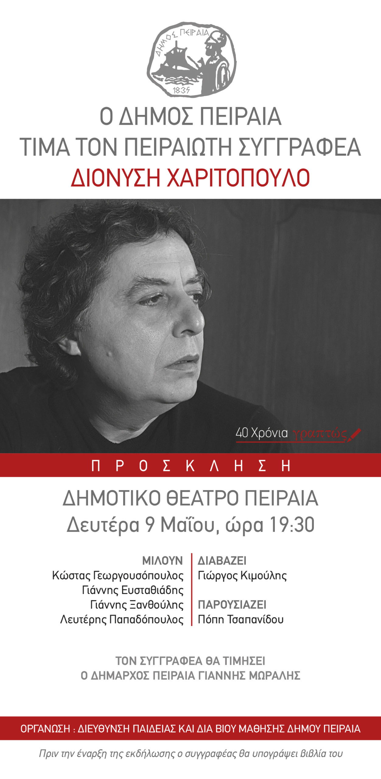Τον ξεχωριστό Πειραιώτη συγγραφέα Διονύση Χαριτόπουλο θα τιμήσει ο δήμος Πειραιά.
