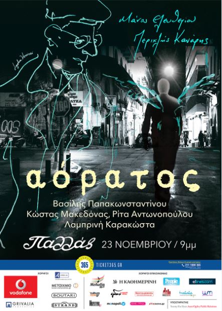 «ΑΟΡΑΤΟΣ»Δύο Γενιές – Δύο ΉπειροιΟ Περικλής Κανάρης συναντά το Μάνο Ελευθερίου στο Θέατρο ΠαλλάςΤετάρτη 23 Νοεμβρίου 2016Στην πρώτη του εμφάνιση στη γενέτειρά του, την Αθήνα, ο συνθέτης Περικλής Κανάρης παρουσιάζει τον «Αόρατο», μια μοναδική σύμπραξη με τον κορυφαίο ποιητή και στιχουργό Μάνο Ελευθερίου, στο Θέατρο Παλλάς την Τετάρτη 23 Νοεμβρίου 2016.Οι διακεκριμένοι ερμηνευτές Βασίλης Παπακωνσταντίνου, Κώστας Μακεδόνας, Ρίτα Αντωνοπούλου και Λαμπρινή Καρακώστα θα παρουσιάσουν τα νέα τραγούδια του «Αόρατου» καθώς επίσης και σημαντικές στιγμές του σπουδαίου στιχουργού στο ελληνικό τραγούδι, πλαισιωμένοι από μια ομάδα εξαιρετικά ταλαντούχων μουσικών από όλο τον κόσμο.Μετά την επιτυχημένη παρουσίασή του στο Tribeca Performing Arts Center της Νέας Υόρκης τον Οκτώβριο του 2014, όπου και αγκαλιάστηκε θερμά από το κοινό της Νέας Υόρκης, ο «Αόρατος,» μια συλλογή τραγουδιών που παντρεύουν την ελληνική μουσική παράδοση με το σήμερα μέσα από την αισθαντικά μελαγχολική μουσική του Περικλή Κανάρη και τους μαγευτικούς στίχους του Μάνου Ελευθερίου, παρουσιάζεται επιτέλους και στην Αθήνα.Ανακαλώντας στιγμές-ορόσημα στη μακρά σταδιοδρομία του Ελευθερίου, στη συναυλία θα παρουσιαστούν επίσης έργα εννιά διακεκριμένων Ελλήνων συνθετών (Ανδριόπουλος, Θεοδωράκης, Κουγιουμτζής, Μαρκόπουλος, Μικρούτσικος, Μούτσης, Νικολόπουλος, Ξαρχάκος, Σπανός), δοσμένα με την ιδιαίτερη ματιά των ενορχηστρώσεων του Περικλή Κανάρη. Οι μουσικοί του από την Ελλάδα και το εξωτερικό θα καταθέσουν τις ξεχωριστές, προσωπικές ερμηνείες τους, μέσα από αναπάντεχους και ταυτόχρονα καθηλωτικούς αυτοσχεδιασμούς, πάντοτε υπό την καθοδήγηση του συνθέτη που θα τους συνοδεύει στο τραγούδι και στο πιάνο.Οι πέντε Νεοϋορκέζοι μουσικοί, που αποτελούν και τους μόνιμους συνεργάτες του Περικλή Κανάρη στην Αμερική, έχουν συνεργαστεί, μεταξύ άλλων, με τους Sir Elton John, Sting, Stevie Wonder, Bono & The Edge από τους U2, Annie Lennox George Michael και Carlos Santana.Οι Νεοϋορκέζοι: Ben Butler (κιθάρα, μαντολίνο)Gary Schreider (ακορντεόν/φυσαρμόνικα)Richard Hammond (μπάσο)Peter Douskalis (κιθάρα)Giancarlo de Trizio (κρουστά)Οι Αθηναίοι: Γιώργος Κοντογιάννης (κρητική λύρα)Μαρίνα Κολοβού (τσέλο)Δημήτρης Ρέππας (ούτι/μπουζούκι)Χρήστος Μπέκας (μπουζούκι)Θόδωρος Λεμπέσης (τρομπέτα)Το κοινό θα ζήσει την εμπειρία μιας ολοκληρωμένης ηχητικής και εικαστικής παράστασης, με την υπογραφή της διεθνούς φήμης εικαστικού Λυδίας Βενιέρη, που έχει επιμεληθεί και το εξώφυλλο του άλμπουμ «Αόρατος.» Τη σκηνοθεσία υπογράφει ο αναγνωρισμένος νέος σκηνοθέτης Λευτέρης Γιοβανίδης.Ο «Aόρατος,» σε στίχους του μεγάλου Έλληνα στιχουργού και ποιητή Mάνου Eλευθερίου, με τη συμμετοχή κορυφαίων ερμηνευτών όπως οι Βασίλης Παπακωνσταντίνου, Κώστας Μακεδόνας, Ρίτα Αντωνοπούλου, Λαμπρινή Καρακώστα καθώς και μουσικών διεθνούς κύρους από τις σκηνές της Αθήνας και της Νέας Υόρκης, κυκλοφόρησε στην Αμερική το 2014. Τον Μάρτιο του 2016, ο «Αόρατος» κυκλοφόρησε και στην Ελλάδα, από τις εκδόσεις Μετρονόμος.https://www.facebook.com/pericleskanarishttp://www.pericleskanaris.com/ ΠΛΗΡΟΦΟΡΙΕΣ Τετάρτη 23 Νοεμβρίου 2016Ώρα έναρξης 21.00Θέατρο Παλλάς: Βουκουρεστίου 5, City Link Τιμές Εισιτηρίων: Προπώληση από 11 ευρώΣημεία Προπώλησης Εισιτηρίων: