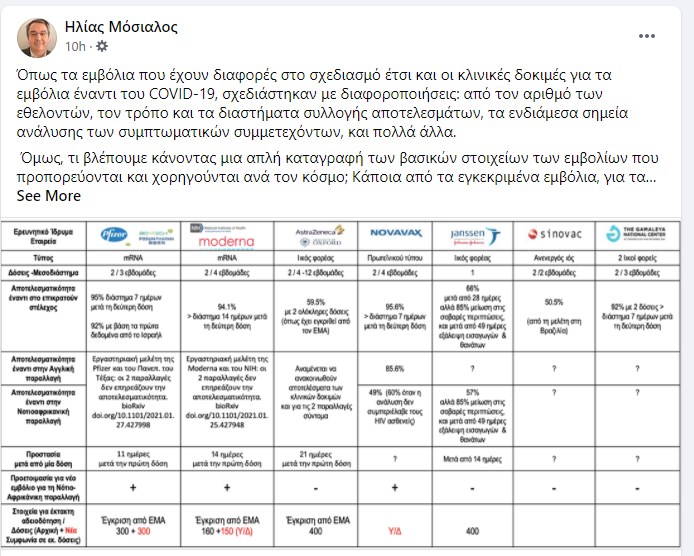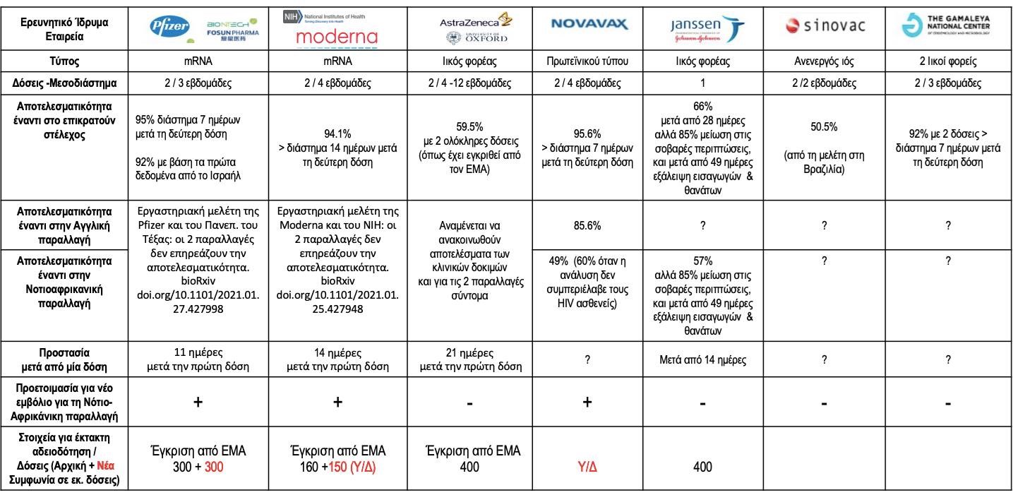 Ο κ.Μόσιαλος παρουσιάζει ένα πίνακα με απλή συγκριτική μελέτη των επτά εμβολίων και κάποια στοιχεία για την αποτελεσματικότητα στο επικρατούν στέλεχος και τις δύο σημαντικές παραλλαγές. «Αυτό που προέχει τώρα», όπως λέει, «είναι να αυξηθεί η παραγωγή και η διανομή των εμβολίων, καθώς και ο ρυθμός των εμβολιασμών. Μόνο έτσι θα λήξει η πανδημία».
