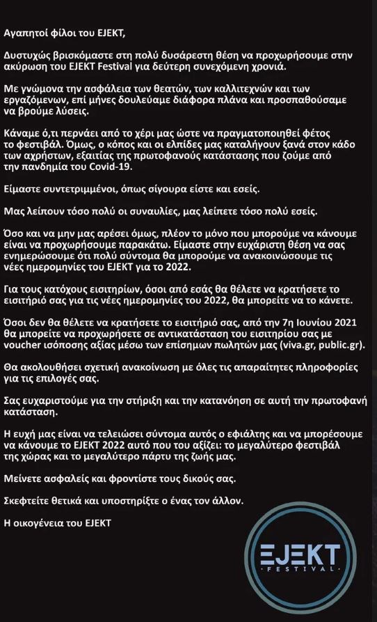 Να σημειωθεί πως ήδη οι διοργανωτές του Eject Festival ανακοίνωσαν την ακύρωσή του για δεύτερη συνεχόμενη χρονιά.