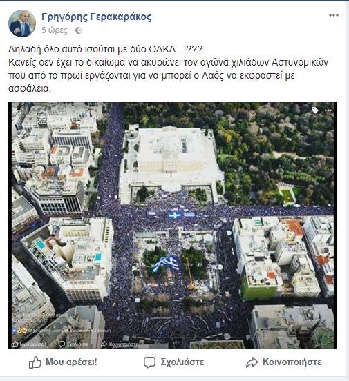 Συγκεκριμένα, στην ανάρτησή του ο κ. Γερακαράκος δημοσίευσε μία πανοραμική φωτογραφία του πλήθους στο Σύνταγμα και ανέφερε: Δηλαδή όλο αυτό ισούται με δύο ΟΑΚΑ… ??? Κανείς δεν έχει το δικαίωμα να ακυρώνει τον αγώνα χιλιάδων αστυνομικών που από το πρωί εργάζονται για να μπορεί ο Λαός να εκφραστεί με ασφάλεια”.