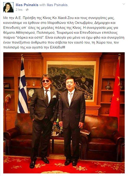 «Με την Α.Ε. Πρέσβη της Κίνας Κο Xiaoli Zou και τους συνεργάτες μας, κανονίσαμε να έρθουν στο Μαραθώνα τέλη Οκτωβρίου, Δήμαρχοι και Επενδυτές απ´ όλες τις μεγάλες πόλεις της Κίνας. Η συνεργασία μας για θέματα Αθλητισμού, Πολιτισμού, Τουρισμού και Επενδύσεων επιτέλους παίρνει “σάρκα και οστά”. Είναι ευλογία για μένα να έχω φίλο και συνεργάτη έναν πανέξυπνο άνθρωπο που σέβεται τον εαυτό του, τη Χώρα του, τον πολιτισμό της και αγαπά την Ελλάδα!!!» έγραψε ο Ηλίας Ψινάκης.