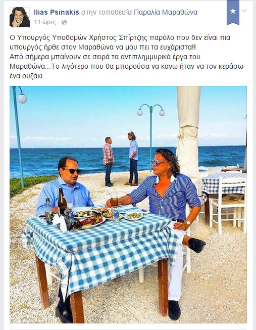 «Ο Υπουργός Υποδομών Χρήστος Σπίρτζης παρόλο που δεν είναι πια υπουργός ήρθε στον Μαραθώνα να μου πει τα ευχάριστα!! Από σήμερα μπαίνουν σε σειρά τα αντιπλημμυρικά έργα του Μαραθώνα.Το λιγότερο που θα μπορούσα να κάνω για να τον ευχαριστήσω…ήταν να τον κεράσω ένα ουζάκι…», έγραψε ο δήμαρχος του Μαραθώνα.