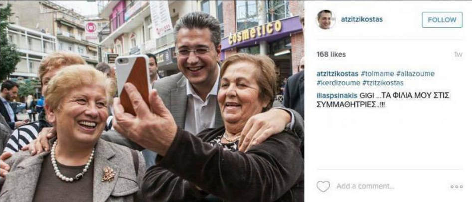 Ένα χιουμοριστικό σχόλιο ανήρτησε στον λογαριασμό Instagram του Απόστολου Τζιτζικώστα ο δήμαρχος του Μαραθώνα Ηλίας Ψινάκης, με αφορμή μία selfie φωτογραφία που είχε ανεβάσει ο υποψήφιος για την ηγεσία της Νέας Δημοκρατίας με δύο ηλικιωμένες γυναίκες.