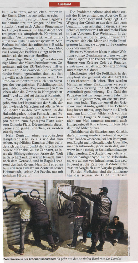 Η Γερμανίδα δημοσιογράφος παραθέτει την προσωπική ιστορία ενός Αφγανού μετανάστη, ο οποίος “ζει υπό τον τρόμο των κουκουλοφόρων, που επιτίθενται με ρόπαλα και μαχαίρια και κυνηγάνε αδιάκριτα, όποιον έχει σκούρο δέρμα ή ασιατικά χαρακτηριστικά”.”Πριν από περίπου μισό χρόνο έδειραν τόσο άσχημα τον μεταφραστή μου, που τον έστειλαν στο νοσοκομείο” λέει στη δημοσιογράφο ο οδοντίατρος και μέλος των “Γιατρών του Κόσμου” Ν. Κανάκης, ο οποίος μετά το περιστατικό, “αναγκάστηκε να πηγαίνει στη δουλειά του με το αυτοκίνητο, καθώς και να προσλάβει δύο άντρες security προκειμένου να φυλάνε την πολυκλινική της οδού Σαπφούς, όπου εργάζεται εθελοντικά” σημειώνει η κ Heyer. “H Χρυσή Αυγή ….””Πάνω από 10.000 μέλη αριθμεί η ακροδεξιά οργάνωση της Χρυσής Αυγής, η οποία στις τελευταίες δημοσκοπήσεις συγκεντρώνει ποσοστά ικανά ώστε να εισέλθει στη Βουλή” αναφέρει στο δημοσίευμα και συνεχίζει “τα ποσοστά της- υποκινούμενης βίας- έχουν αυξηθεί δραματικά στο κέν��ρο της Αθήνας. Μόνο από τον Οκτώβρη του ’11 μέχρι το Γενάρη του ’12 έχουν επίσημα καταγραφεί 61 επιθέσεις κατά τις οποίες τα θύματα ξυλοκοπήθηκαν ή μαχαιρώθηκαν, ενώ ανάμεσά τους υπήρχαν γυναίκες και παιδιά”.”Υπάρχει η υποψία ότι πολλοί αστυνομικοί -τουλάχιστον- συμπαθούν τα μέλη της Χρυσής Αυγής” γράφει η δημοσιογράφος και αναφέρει ότι ο πρόεδρος της οργάνωσης, Μιχαλολιάκος -αστειευόμενος- είπε ότι μέχρι να στείλει η Ε.Ε. τους μετανάστες στην πατρίδα τους, “τους διώκουν τα οργανωμένα μέλη της Χ.Α.””Το κέντρο της πόλης έχει μετατραπεί σε άνδρο εγκληματικότητας, λέει ο ίδιος ο Δήμαρχος της Αθήνας, Γιώργος Καμίνης, ωστόσο ακούγεται περισσότερο παραιτημένος παρά μαχητικός” προσθέτει η κ. Heyer.