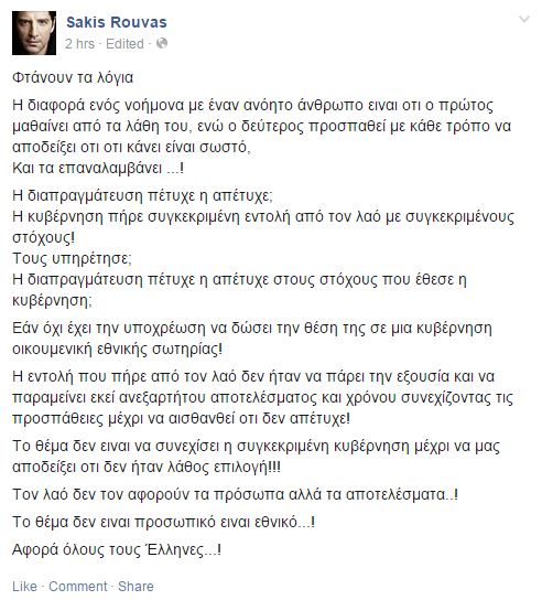 Μέσω του προσωπικού του λογαριασμού στο Facebook επέλεξε να σχολιάσει την απόφαση της κυβέρνησης για δημοψηφισμα, ο Σάκης Ρουβάς. Ο δημοφιλής καλλιτέχνης υποστηρίζει οτι “η εντολή που πήρε η κυβέρνηση δεν ήταν να πάρει την εξουσία και να παραμείνει εκεί ανεξαρτήτου αποτελέσματος και χρόνου” ενώ προτείνει, εαν η διαπραγματευση απέτυχε στους στόχους που έθεσε η κυβέρνηση, “έχει την υποχρέωση να δώσει την θέση της σε μια κυβέρνηση οικουμενική, εθνικής σωτηρίας.”, καταλήγοντας οτι “το θέμα δεν είναι προσωπικό, είναι εθνικό και αφορά όλους τους Έλληνες”