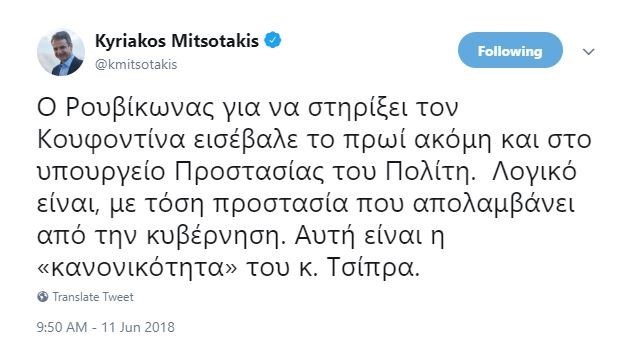 “Ο Ρουβίκωνας για να στηρίξει τον Κουφοντίνα εισέβαλε το πρωί ακόμη και στο υπουργείο Προστασίας του Πολίτη. Λογικό είναι, με τόση προστασία που απολαμβάνει από την κυβέρνηση. Αυτή είναι η ‘κανονικότητα’ του κ. Τσίπρα”, έγραψε ο Πρόεδρος της ΝΔ.