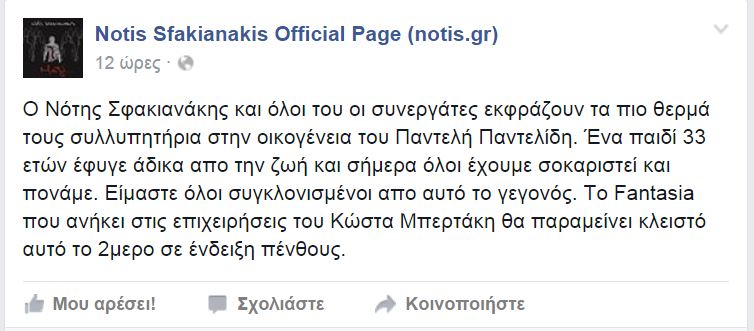 “Ο Νότης Σφακιανάκης και όλοι του οι συνεργάτες εκφράζουν τα πιο θερμά τους συλλυπητήρια στην οικογένεια του Παντελή Παντελίδη. Ένα παιδί 33 ετών έφυγε άδικα απο την ζωή και σήμερα όλοι έχουμε σοκαριστεί και πονάμε. Είμαστε όλοι συγκλονισμένοι απο αυτό το γεγονός. Το Fantasia που ανήκει στις επιχειρήσεις του Κώστα Μπερτάκη θα παραμείνει κλειστό αυτό το 2μερο σε ένδειξη πένθους”.