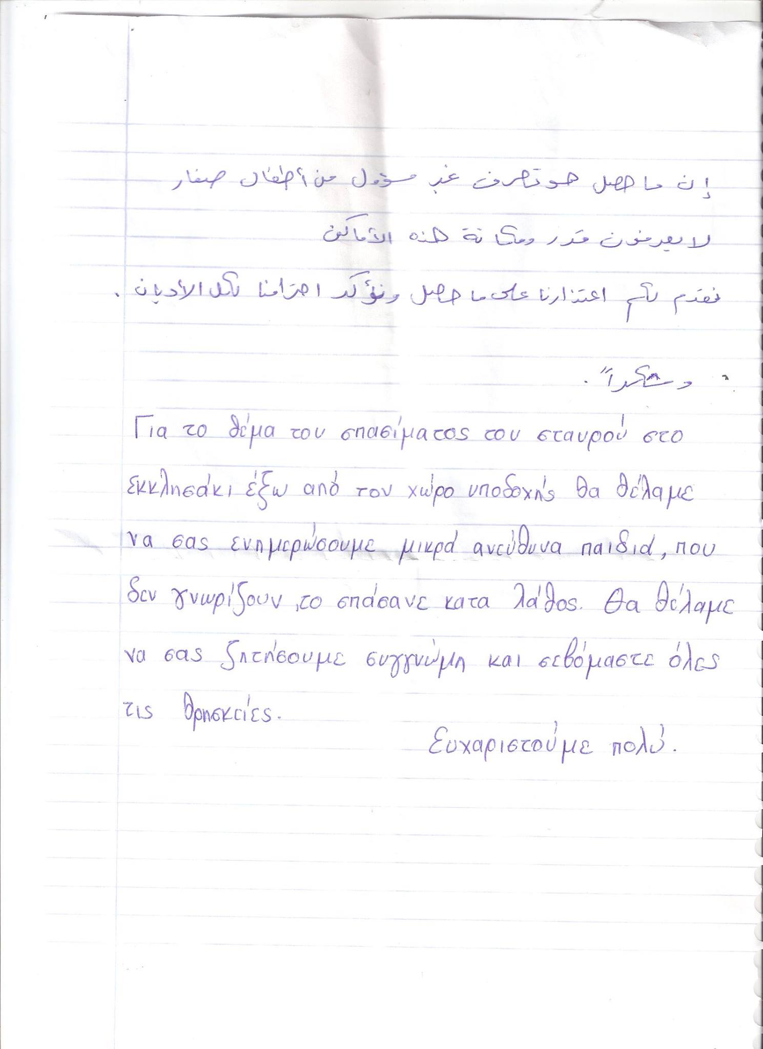 Με επιστολή τους, μάλιστα, οι πρόσφυγες ενημέρωσαν ότι «υπεύθυνοι» για την καταστροφή, ήταν παιδάκια που το έσπασαν κατά λάθος στο παιχνίδι, ζήτησαν συγγνώμη εκ μέρους τους και εξέφρασαν το σεβασμό τους για όλες τις θρησκείες.