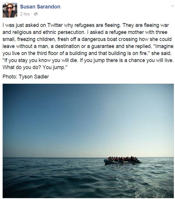 «Με ρώτησαν στο Twitter γιατί οι πρόσφυγες φεύγουν από την πατρίδα τους. Φεύγουν για να αποφύγουν τον πόλεμο και τους θρησκευτικούς και εθνικούς διωγμούς. Ρώτησα μία πρόσφυγα, μητέρα με τρία μικρά παιδιά, τα οποία πάγωναν από το κρύο, λίγο μετά από ένα επικίνδυνο ταξίδι με βάρκα, πως μπόρεσε να φύγει χωρίς έναν άνδρα, χωρίς κάποιον προορισμό, χωρίς μία εγγύηση και απάντησε: “Φαντάσου να ζεις στον τρίτο όροφο ενός κτιρίου το οποίο καίγεται. Αν μείνεις ξέρεις πως θα πεθάνεις. Αν πηδήξεις υπάρχει μια πιθανότητα να επιζήσεις. Τι κάνεις; Πηδάς”».