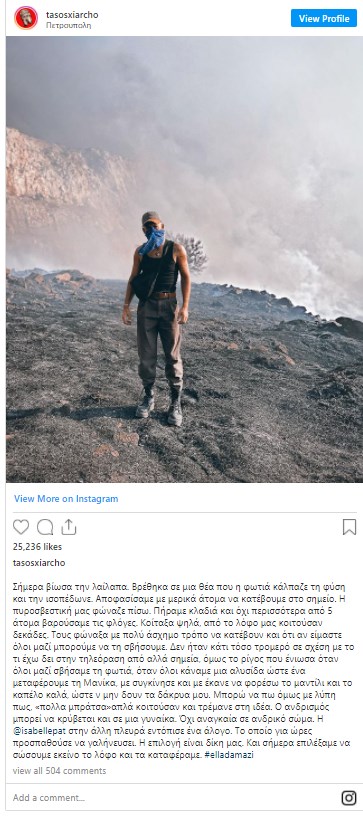 «Σήμερα βίωσα την λαίλαπα. Βρέθηκα σε μια θέα που η φωτιά κάλπαζε τη φύση και την ισοπέδωνε. Αποφασίσαμε με μερικά άτομα να κατέβουμε στο σημείο. Η Πυροσβεστική μας φώναζε πίσω. Πήραμε κλαδιά και όχι περισσότερα από 5 άτομα βαρούσαμε τις φλόγες. Κοίταξα ψηλά, από το λόφο μας κοιτούσαν δεκάδες. Τους φώναξα με πολύ άσχημο τρόπο να κατέβουν και ότι αν είμαστε όλοι μαζί μπορούμε να τη σβήσουμε. Δεν ήταν κάτι τόσο τρομερό σε σχέση με το τι έχω δει στην τηλεόραση από αλλά σημεία, όμως το ρίγος που ένιωσα όταν όλοι μαζί σβήσαμε τη φωτιά, όταν όλοι κάναμε μια αλυσίδα ώστε να μεταφέρουμε τη μάνικα, με συγκίνησε και με έκανε να φορέσω το μαντίλι και το καπέλο καλά, ώστε να μην δουν τα δάκρυα μου. Μπορώ να πω όμως με λύπη πως, “πολλά μπράτσα” απλά κοιτούσαν και τρέμανε στη ιδέα. Ο ανδρισμός μπορεί να κρύβεται και σε μια γυναίκα. Όχι αναγκαία σε ανδρικό σώμα. Η @isabellepat στην άλλη πλευρά εντόπισε ένα άλογο. Το οποίο για ώρες προσπαθούσε να γαληνεύσει. Η επιλογή είναι δίκη μας. Και σήμερα επιλέξαμε να σώσουμε εκείνο το λόφο και τα καταφέραμε», έγραψε χαρακτηριστικά στην ανάρτησή του στο Instagram.