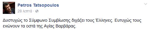 Ο Πέτρος Τατσόπουλος έγραψε στο Facebook: «Δυστυχώς το Σύμφωνο Συμβίωσης διχάζει τους Έλληνες. Ευτυχώς τους ενώνουν τα οστά της Αγίας Βαρβάρας».