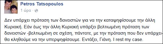 «Δεν υπάρχει πρόταση των δανειστών για να την καταψηφίσουμε την άλλη Κυριακή. Εάν έως την άλλη Κυριακή υπάρξει βελτιωμένη πρόταση των δανειστών -βελτιωμένη σε σχέση, πάντοτε, με την πρόταση που δεν υπάρχει- θα κληθούμε να την υπερψηφίσουμε. Εντάξει, Γιάνη. I rest my case», έγραψε ο Πέτρος Τατσόπουλος.