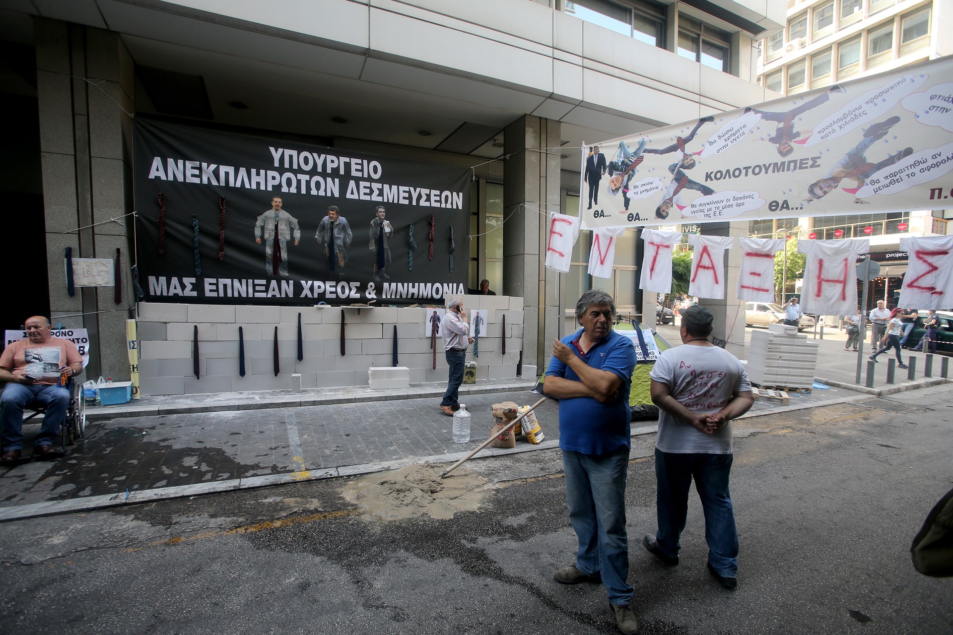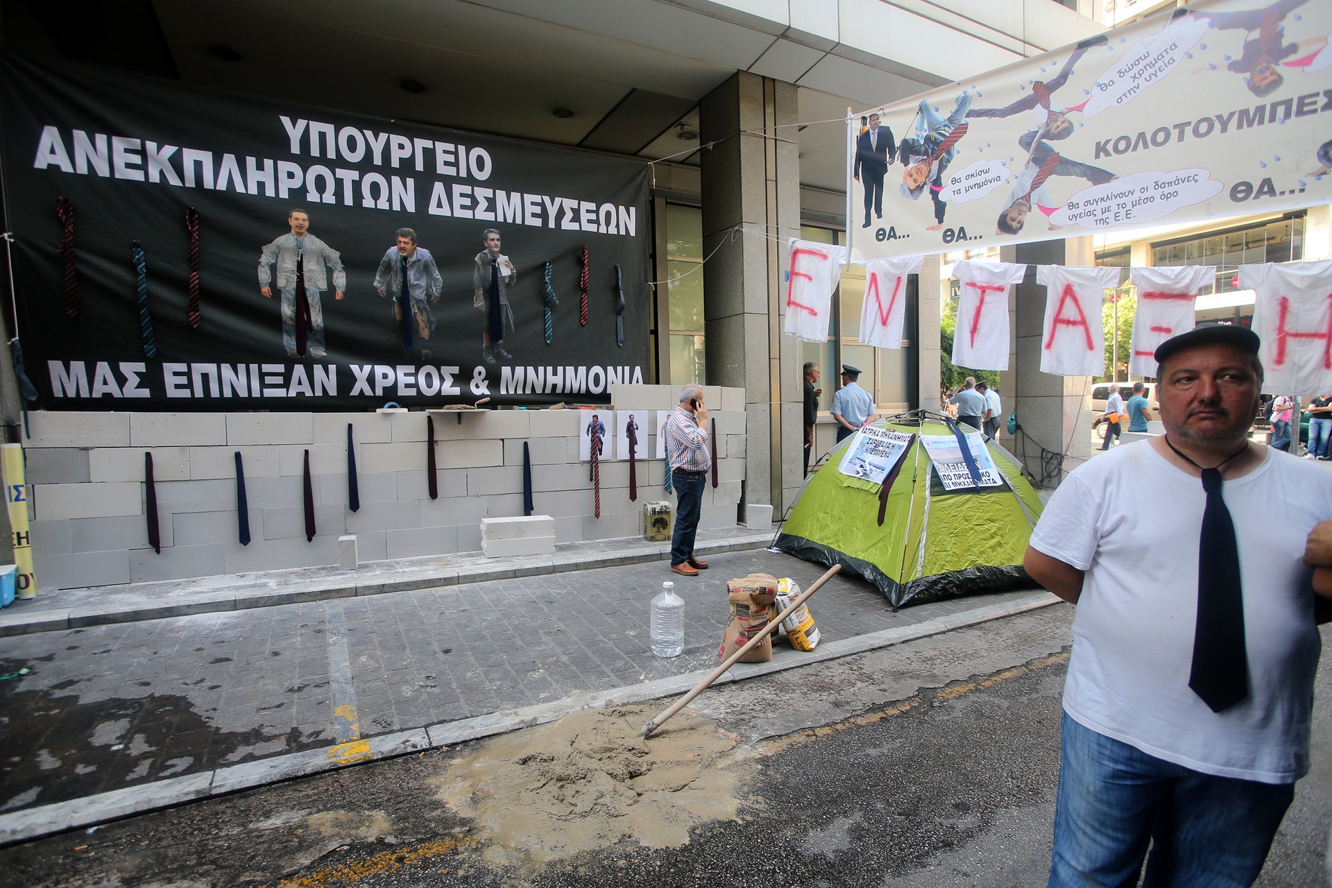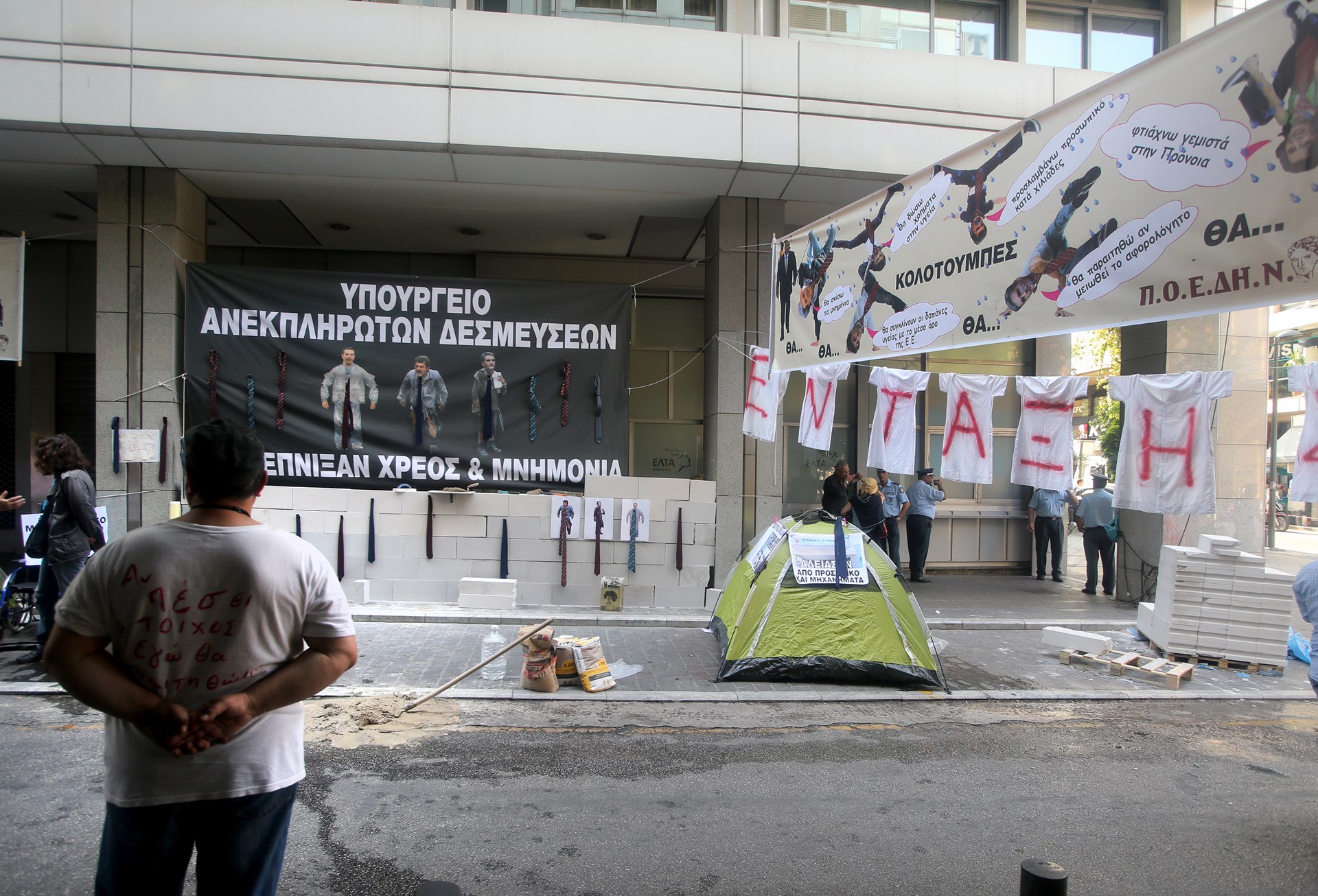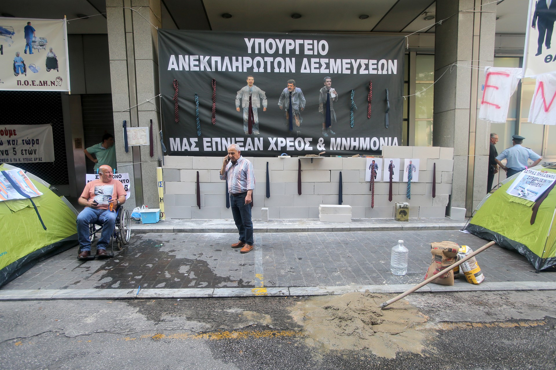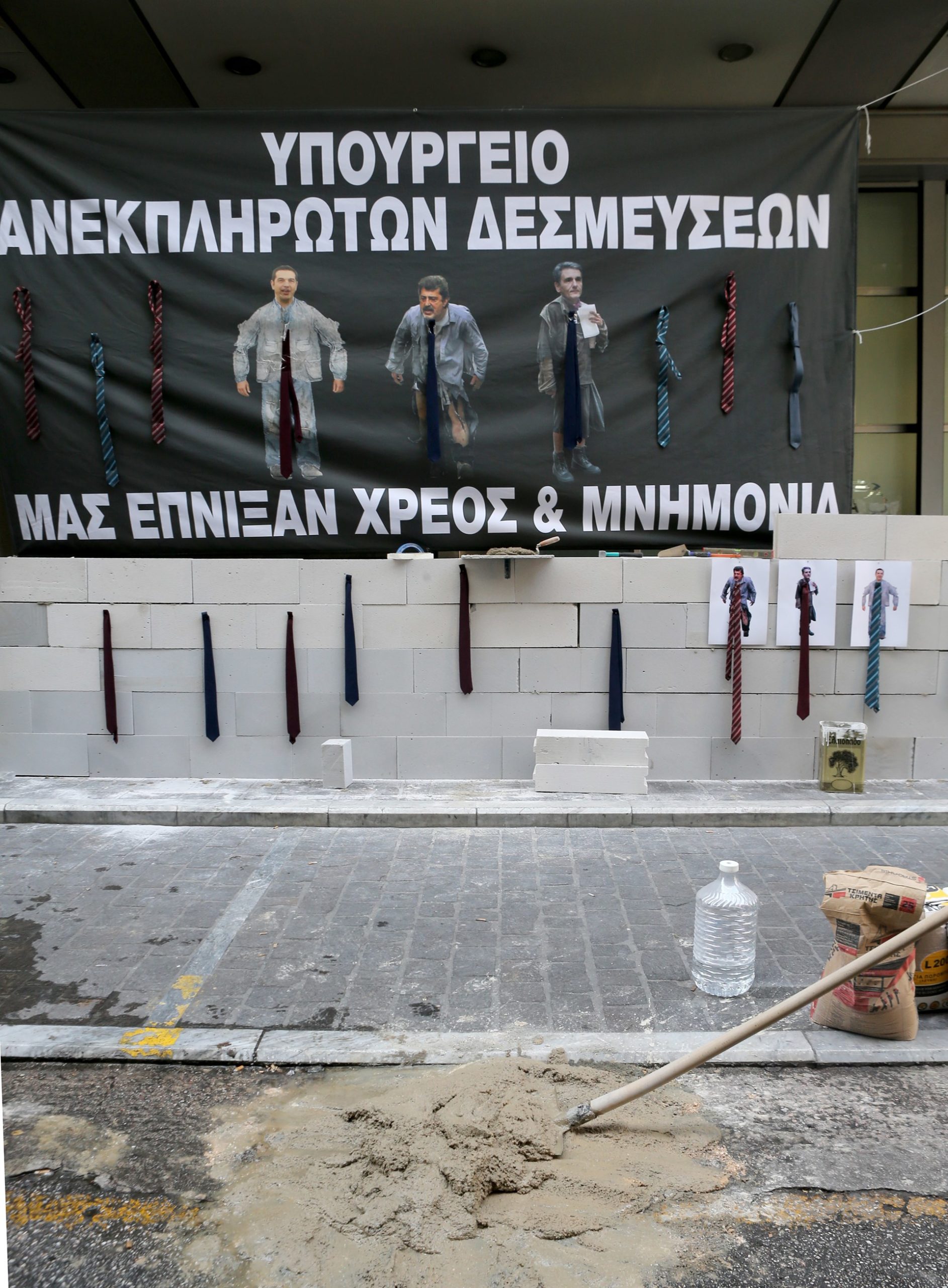 Όπως φαίνεται και στις φωτογραφίες, τα μέλη της ΠΟΕΔΗΝ “έχτισαν” την είσοδο του κτιρίου και ανήρτησαν ένα πανό με γραβάτες.