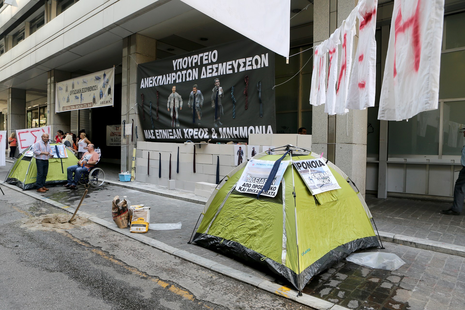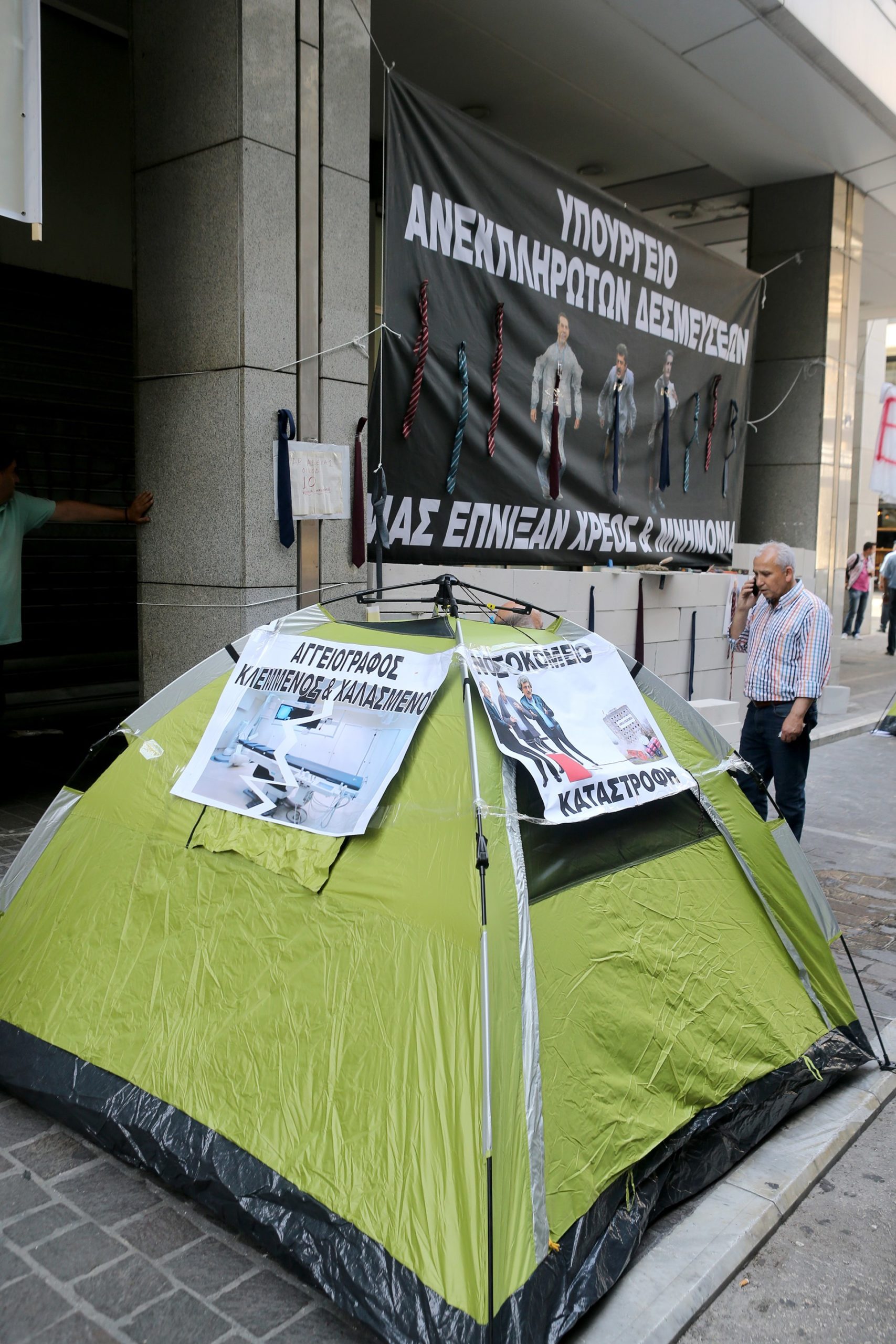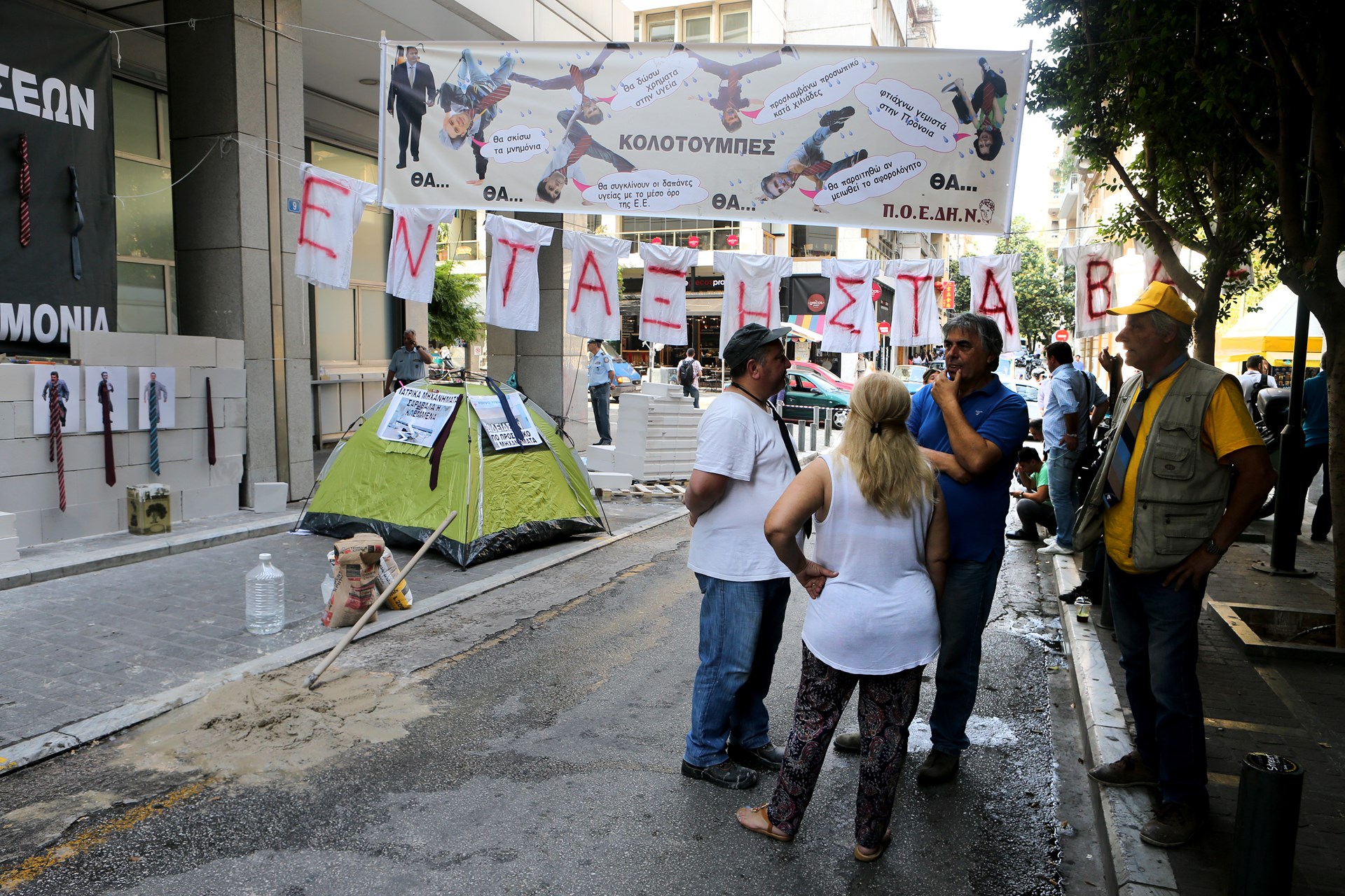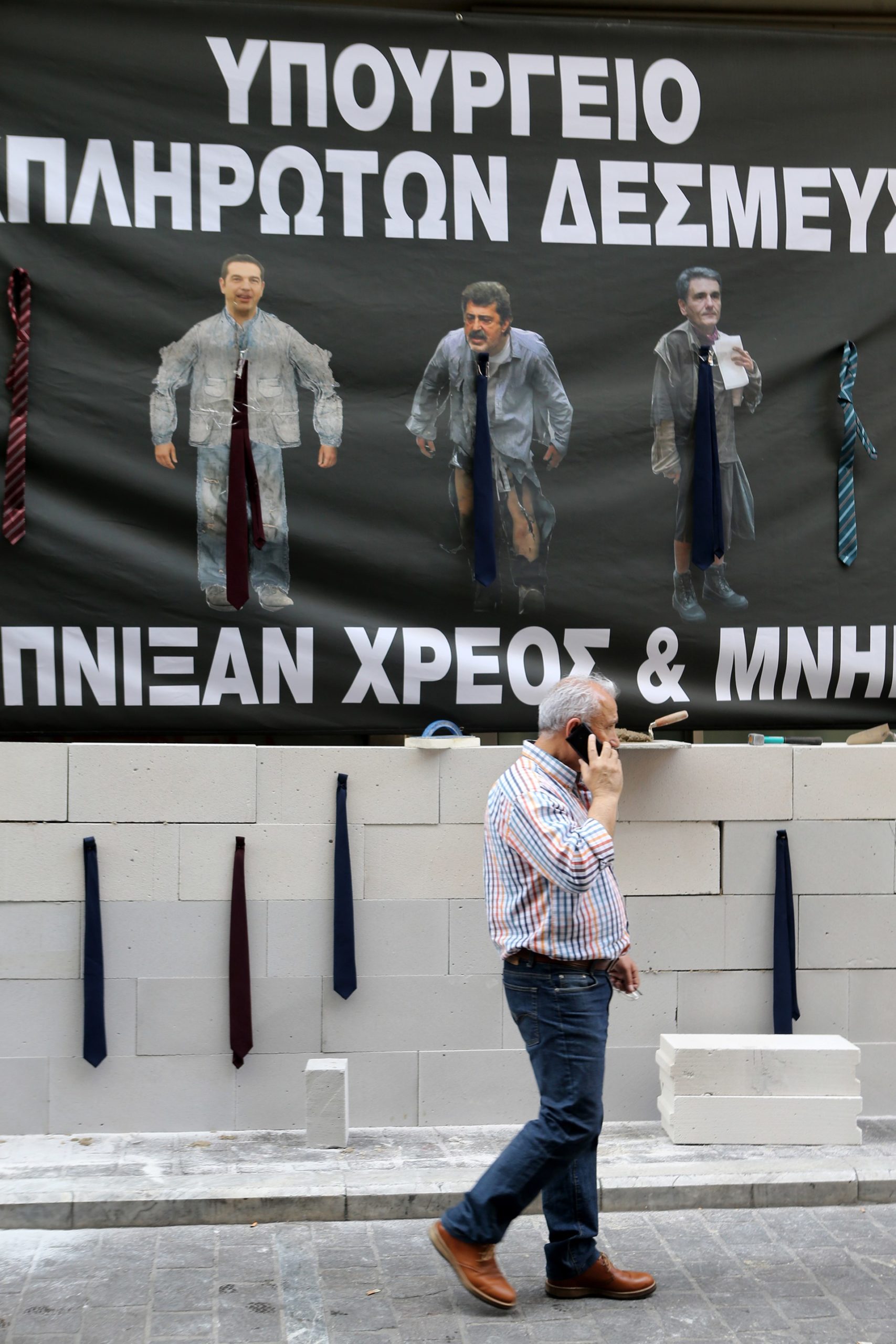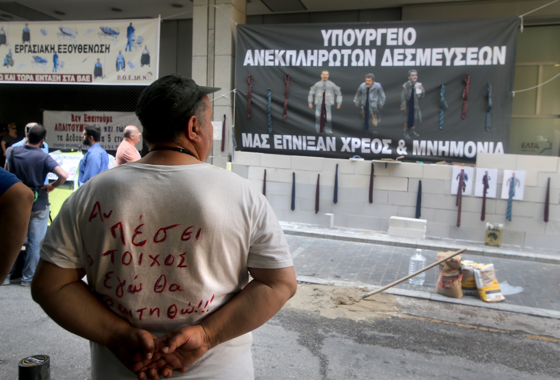 Όπως φαίνεται και στις φωτογραφίες, τα μέλη της ΠΟΕΔΗΝ “έχτισαν” την είσοδο του κτιρίου και ανήρτησαν ένα πανό με γραβάτες.