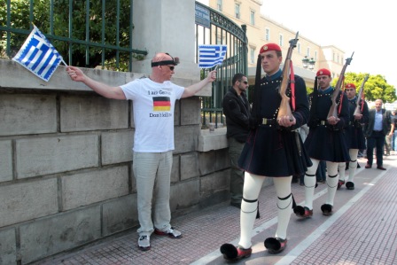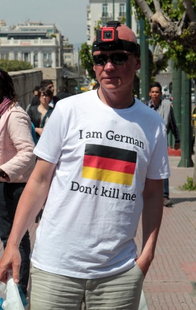Ένας Γερμανός τουρίστας, σήμερα το πρωί, στεκόταν έξω από τη Βουλή, κρατώντας δύο ελληνικές σημαίες και φορώντας ένα μπλουζάκι που έγραφε τη φράση «Είμαι Γερμανός. Μην με σκοτώσετε».