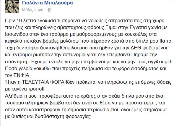 Με ανάρτησή της στο Facebook η Γιολάντα Μπαλαούρα περιγράφει τις στιγμές τρόμου που έζησε πριν από λίγο στη Θεσσαλονίκη όταν κουκουλοφόροι πέταξαν μολότοφ προς τις δυνάμεις των ΜΑΤ που βρίσκονταν στη συμβολή των οδών Εγνατία με Ιασωνίδου. Παράλληλα η γνωστή ηθοποιός ξεσπά κατά του κράτους και τονίζει ότι δεν πρόκειται να πληρώσει τις επόμενες δόσεις του φόρου εισοδήματος και του ΕΝΦΙΑ.
