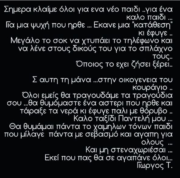 «Σήμερα κλαίμε όλοι για ένα νέο παιδί.. για ένα καλό παιδί… για μία ψυχή που ήρθε.. Έκανε μία ‘κατάθεση’ και έφυγε… Μεγάλο το σοκ να χτυπάει το τηλέφωνο και να λένε στους δικούς του για το σπλάχνο τους.. Όποιος το έχει ζήσει ξέρει.. Σ αυτή τη μάνα.. στην οικογένειά του κουράγιο.. Όλοι εμείς θα τραγουδάμε τα τραγούδια σου.. θα θυμόμαστε ένα αστέρι που ήρθε και τάραξε τα νερά και έφυγε πάλι με θόρυβο. Καλό ταξίδι Παντελή μου.. θα θυμάμαι πάντα το χαμηλών τόνων παιδί που μίλαγε πάντα με σεβασμό και αγάπη για όλους… και μην στεναχωριέσαι.. εκεί που πας θα σε αγαπάνε όλοι..» έγραψε ο Γιώργος Τσαλίκης.
