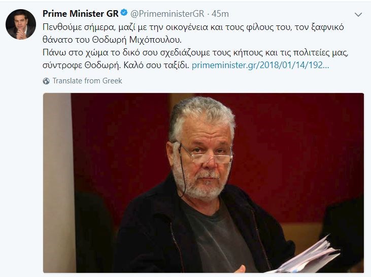“Πενθούμε σήμερα, μαζί με την οικογένεια και τους φίλους του, τον ξαφνικό θάνατο του Θοδωρή Μιχόπουλου. Πάνω στο χώμα το δικό σου σχεδιάζουμε τους κήπους και τις πολιτείες μας, σύντροφε Θοδωρή. Καλό σου ταξίδι”, έγραψε στο twitter ο πρωθυπουργός Αλέξης Τσίπρας για τον θάνατο του δημοσιογράφου Θοδωρή Μιχόπουλου, που υπήρξε και διευθυντής του Γραφείου Τύπου του πρωθυπουργού.