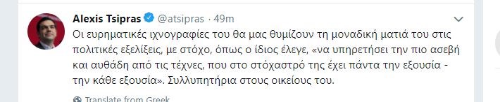 «Οι ευρηματικές ιχνογραφίες του», σημειώνει ο πρωθυπουργός, «θα μας θυμίζουν τη μοναδική ματιά του στις πολιτικές εξελίξεις, με στόχο, όπως ο ίδιος έλεγε, «να υπηρετήσει την πιο ασεβή και αυθάδη από τις τέχνες, που στο στόχαστρό της έχει πάντα την εξουσία – την κάθε εξουσία»». Εκφράζει, τέλος, τα συλλυπητήρια του στους οικείους του.