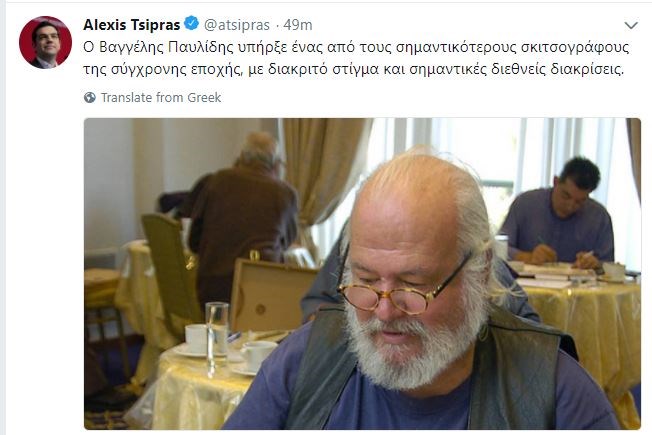 «Ο Βαγγέλης Παυλίδης υπήρξε ένας από τους σημαντικότερους σκιτσογράφους της σύγχρονης εποχής, με διακριτό στίγμα και σημαντικές διεθνείς διακρίσεις», αναφέρει ο Αλέξης Τσίπρας σε ανάρτηση του στο Twitter για τον θάνατο του διακεκριμένου σκιτσογράφου.