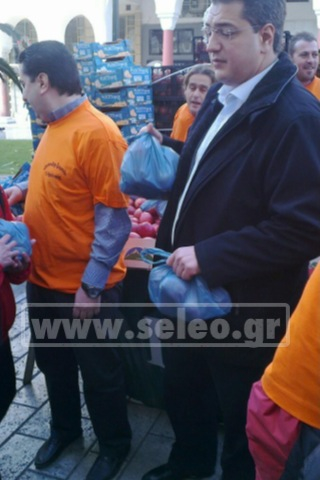 Μοίρασε μήλα, πορτοκάλια, μανταρίνια και πατάτες στο πλαίσιο της διανομής δωρεάν τροφίμων από τους παραγωγούς λαϊκών αγορών σε καταναλωτές της Θεσσαλονίκης.
