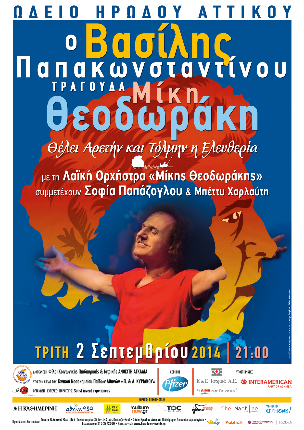 Οι Φίλοι Κοινωνικής Παιδιατρικής & Ιατρικής “ΑΝΟΙΧΤΗ ΑΓΚΑΛΙΑ” παρουσιάζουν στο Ηρώδειο τoν Βασίλη Παπακωνσταντίνου στη συναυλία «Θέλει αρετήν και τόλμην η ελευθερία». Ένα αφιέρωμα στον Μίκη Θεοδωράκη, με την Λαϊκή Ορχήστρα «Μίκης Θεοδωράκης» και τη συμμετοχή της Σοφίας Παπάζογλου και της Μπέττυς Χαρλαύτη.